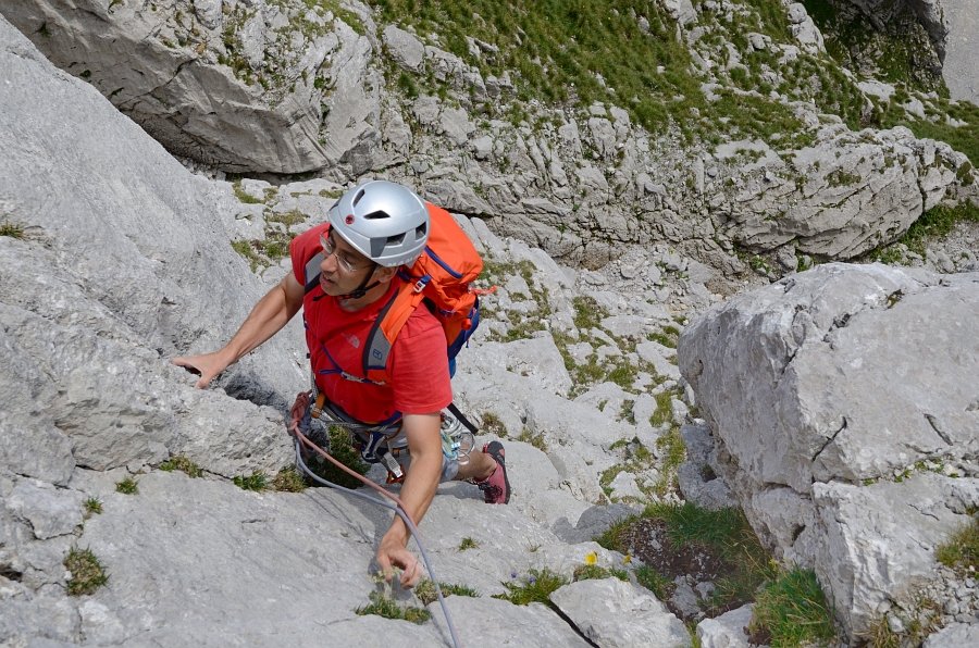 ... and here Arno is about to start to follow a long limestone runnel with painful foot placements and technical, balancy climbing.